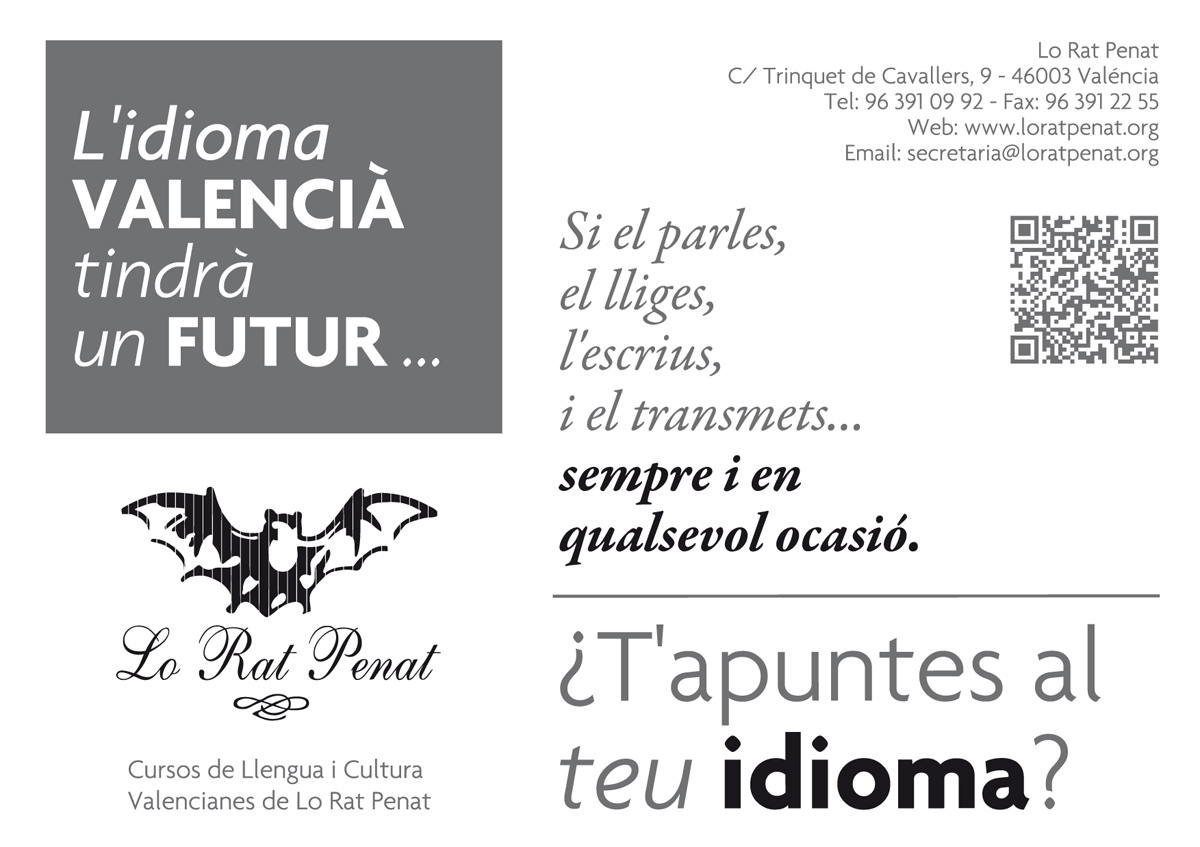LXV edició dels Cursos de Llengua i Cultura Valencianes. Oberta la matrícula. Les classes començaran a partir del 13 d'octubre. Lo Rat Penat inicia un any més els seus Cursos de Llengua i Cultura Valencianes en la seua LXV (65) edició. Una nova edició dels Cursos que organisem des de 1949, seguint en la trayectòria de difusió de la Llengua i Cultura Valencianes, i que enguany presenten importants novetats, d’acort en el Pla d'Estudis que a continuació es detalla. Nivells dels cursos de Llengua (inici 13 d’octubre de 2014): Curs Bàsic: Coneiximent de la llengua valenciana a nivell oral i gramàtica bàsica. Presencial. Curs Elemental: Introducció a la gramàtica i ortografia de les Normes d’El Puig. Presencial i a distància. Curs Mig: Curs de perfeccionament de l’escritura. Profundisació en diversos aspectes de la nostra llengua. Presencial i a distància. Curs Superior: Diverses matèries relacionades en la llengua, la lliteratura i la cultura valenciana componen este curs. Presencial. Curs de Professorat: Curs d’especialisació llingüística i treball final d’investigació / docència dirigit per un mestre del claustre. Curs de Revalencianisació Llingüística (NOVETAT) (inici febrer 2015). Dirigit a persones que ya conten en el títul “Mitjà” de la “Junta Qualificadora” pero desigen revalencianisar la seua ortografia, lèxic, morfosintaxis i fonètica d’acort en la normativa valenciana. La superació en aprofitament d’este curs se convalida en el certificat de Nivell Mig de Lo Rat Penat. Cursos de cultura valenciana: Curs d’Introducció a la Poesia (inici 25 d’octubre 2014): Introducció al món de la poesia valenciana i millora de les tècniques poètiques. Curs d’Interpretació i Direcció Escènica (inici 8 de novembre 2014): Introducció en el món del teatre i millora les actuacions teatrals. Curs de Declamació, retòrica argumentació i debat (inici 13 d’octubre 2014): Introducció a la recitació, la dicció, cóm parlar en públic, el debat, etc. Dirigit a poetes, actors, persones que han de parlar o expondre les seues idees en públic i tot aquell que estiga interessat. Curs de Lliteratura Valenciana (NOVETAT) (inici giner 2015): Introducció a la Lliteratura Valenciana de totes les époques: estils, autors, obres principals de la nostra lliteratura. Mòduls (NOVETAT): Els nivells Bàsic, Elemental, Mig i Superior s’han estructurat en mòduls temàtics, als quals poden matricular-se els alumnes per separat i en la combinació que desigen. La superació de tots els mòduls temàtics d’un nivell, encara que es faça en anys diferents, se convalida pel títul del nivell corresponent. Este sistema oferix la possibilitat de perfeccionar només aquells aspectes concrets de la normativa que interessen més, aixina com obtindre els diferents títuls de Lo Rat Penat a un ritme més pausat. Els mòduls són els següents: | NIVELL | MÒDUL | | BÀSIC | Pràctica de valencià oral | | Ortografia valenciana bàsica | | ELEMENTAL | Gramàtica de la llengua valenciana | | Ortografia de la llengua valenciana | | MIG | Els verps valencians: perfeccionament | | Els pronoms valencians: perfeccionament | | SUPERIOR | Conceptes de llingüística i sociollingüística aplicats al cas valencià | | Dialectologia i evolució diacrònica de la llengua valenciana | | Normativisació de la llengua valenciana | | Història de la llengua I. Del substrat iber a l’Edat Mija | | Història de la llengua II. De l’Edat Moderna a la Contemporànea | | Lliteratura valenciana | Proves de nivell: Existix la possibilitat de realisar proves de nivell, que permeten l’accés directe al nivell Elemental i al nivell Mig. El cost de matrícula d’esta prova es descontarà de la matrícula del curs, si finalment se decidix cursar-lo. Beques: Els menors de 30 anys tindran un 50% de desconte en la matrícula. Si són, ademés, socis de Lo Rat Penat, la matrícula serà totalment gratuïta. Matrícula: Els alumnes poden matricular-se a partir de la segona quinzena de setembre en la Secretaria General de Lo Rat Penat fins al 31 d’octubre, C/ Trinquet de Cavallers, 9, 46003 Valéncia, en horari de 9 h a 14 h i de 16:30 h a 21 h. La matrícula per als mòduls i cursos que escomencen a partir de novembre de 2014, estarà oberta fins dos semanes ans d’escomençar cada acció formativa. Per a més informació pots telefonejar a Lo Rat Penat (963 91 09 92) o be remetre-nos un correu electrònic a
